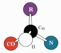 In 19 of the 20 amino acids used for the biosynthesis of proteins, the α-carbon atom is chiral, since four different groups are attached to it. The exception is glycine, which has two hydrogen atoms attached to the α-carbon. All 19 chiral amino acids are in the L configuration, where "L" signifies that the amino acid has the same configuration as L-glyceraldehyde.