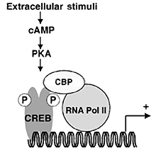CREB is a member of the leucine zipper family of transcription factors and binds CRE as a dimer through its DNA-binding domains. cAMP does not work by altering the DNA binding of CREB; rather phosphorylation of CREB alters the conformation of a region called the kinase-inducible domain (KID). This modification allows the phosphorylated domain (pKID) to interact with the KIX domain of a coactivator called CREB-binding protein (CBP). In turn, formation of the CRE-CREB-CBP complex switches certain genes on or off. As detailed below, NMR studies of the small KIX and KID fragments and the pKID-KIX complex have shown why phosphorylation of CREB is required for binding of CRB.