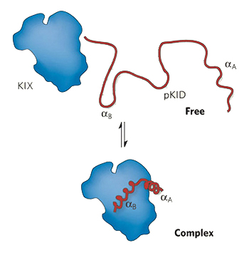 Experiments in which Ser-133 of the kinase activated domain (KID) of CREB protein is converted to Ala-133 show that the Ser residue is critical to the positive regulation of the transcriptional activity of CREB protein by Protein Kinase A. The KID fragment containing residues 119-146 is completely disordered in the absence of KIX. Phosphorylation of Ser-133 to give pKID results in the formation of a stable pKID–KIX complex in which pKID has folded into two α-helices that are at right angles to each other. The NMR structure of the complex provides an in-depth understanding of the noncovalent interactions stabilizing the complex. See .