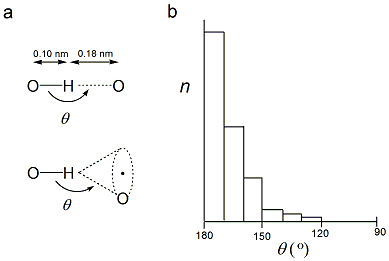 (b) Distribution of values for the angle θ for hydrogen bonds in high-resolution crystallographic structures of proteins and nucleic acids. The angle θ is the angle between the hydrogen bond and the covalent σ bond.