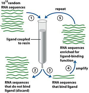 Basic steps in the SELEX selection process are presented in Fig. 1. Over 1015 different DNA oligonucleotides can be created by programming a DNA synthesizer to add equal amounts of G, A, T, and C phosphoramidites at each step of the synthesis. For the selection of DNA aptamers, this library can be used directly in the first round of a DNA SELEX process. For the selection of RNA aptamers, the random DNA oligonucleotide library has to be transformed into a RNA library before starting the first round of an RNA SELEX process. In essence, these repetitive cycles of in vitro selection and enzymatic amplification mimic Darwinian evolution, only that "survival-of-the-fittest" is carried out at the level of individual molecules as opposed to individual organisms. SELEX drives the selection towards a few structures optimized for binding a specific ligand.