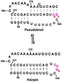 A unimolecular pseudoknot construct composed of nucleotides 93-121 and 166-184 with a U177 deletion was used for the thermodynamic and NMR studies ().