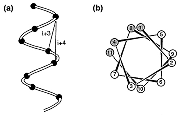 B.) An amphipathic helix. The view is end-on looking from the amino- to carboxyl-terminal amino acid. This type of representation is referred to as a helical wheel. The shaded residues are strongly hydrophobic. In this example, the spacing between residues in the hydrophobic face follow the i + 3 and i + 4 pattern: i + 3 = 1 + 3 = 4; i + 4 = 4 + 4 = 8; and i + 3 = 8 + 3 = 11.